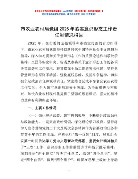 / 市农业农村局党组2025年落实意识形态工作责任制情况报告