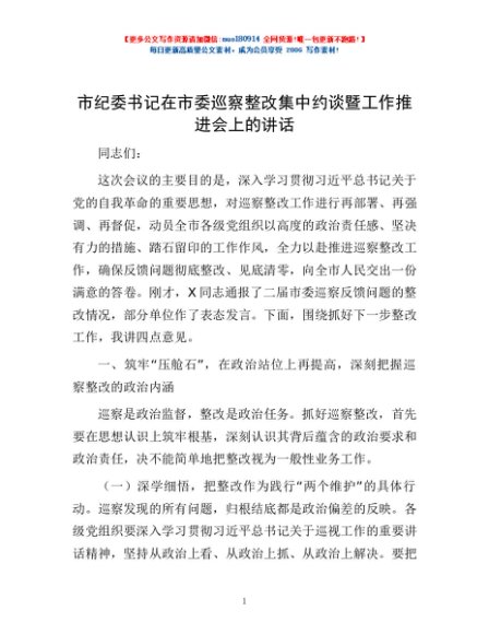 / 市纪委书记在市委巡察整改集中约谈暨工作推进会上的讲话