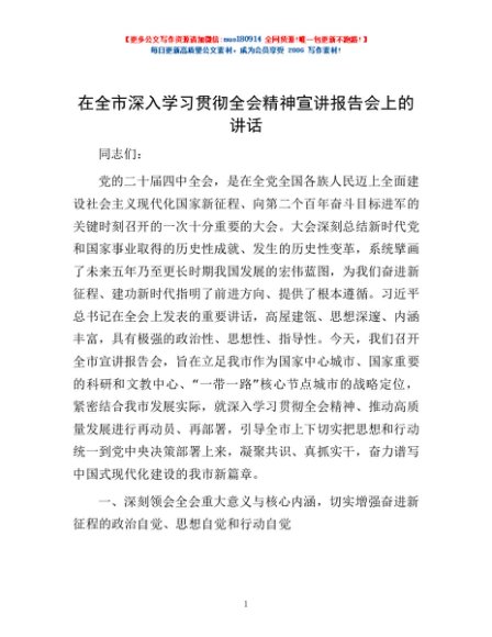/ 在全市深入学习贯彻全会精神宣讲报告会上的讲话