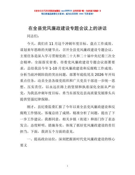 / 在全县党风廉政建设专题会议上的讲话