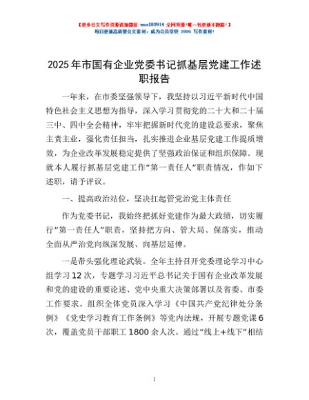 / 2025年市国有企业党委书记抓基层党建工作述职报告