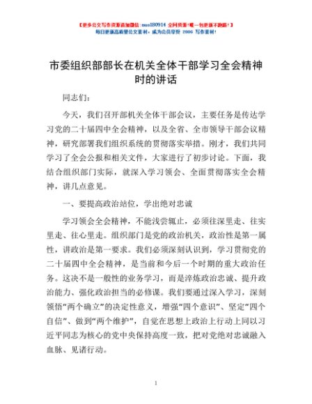 / 市委组织部部长在机关全体干部学习全会精神时的讲话