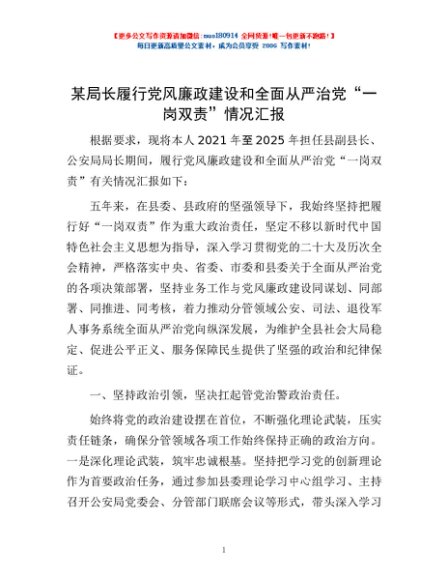 / 某局长履行党风廉政建设和全面从严治党“一岗双责”情况汇报