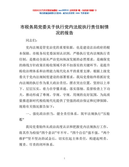 / 市税务局党委关于执行党内法规执行责任制情况的报告