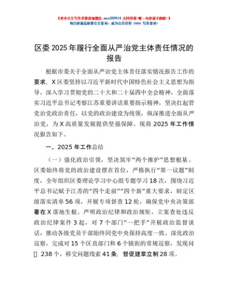 / 区委2025年履行全面从严治党主体责任情况的报告