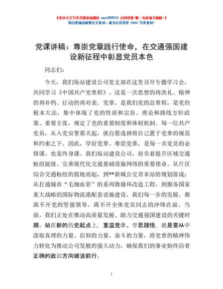/ 党课讲稿:尊崇党章践行使命,在交通强国建设新征程中彰显党员本色