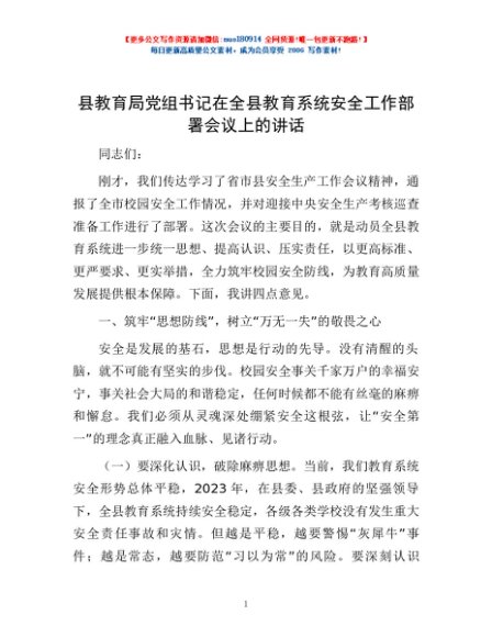 / 县教育局党组书记在全县教育系统安全工作部署会议上的讲话