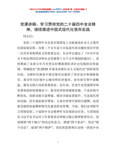 / 党课讲稿:学习贯彻党的二十届四中全会精神,接续推进中国式现代化我市实践