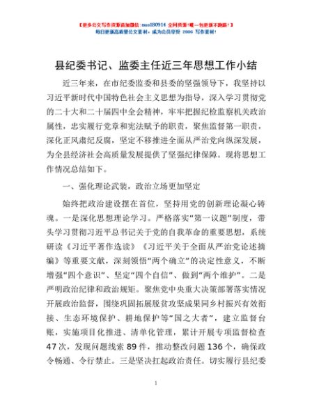 / 县纪委书记、监委主任近三年思想工作小结