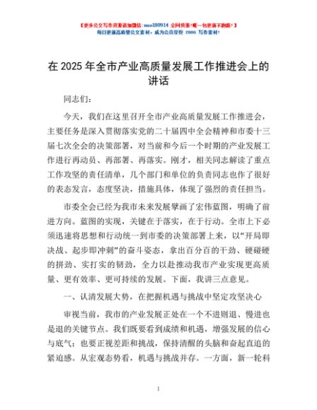 / 在2025年全市产业高质量发展工作推进会上的讲话