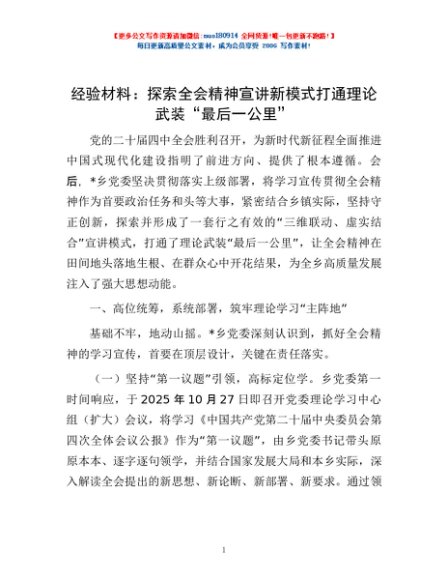 / 经验材料:探索全会精神宣讲新模式 打通理论武装“最后一公里”