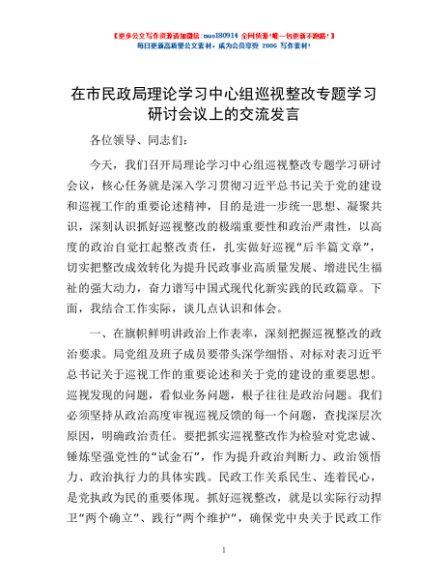 / 在市民政局理论学习中心组巡视整改专题学习研讨会议上的交流发言