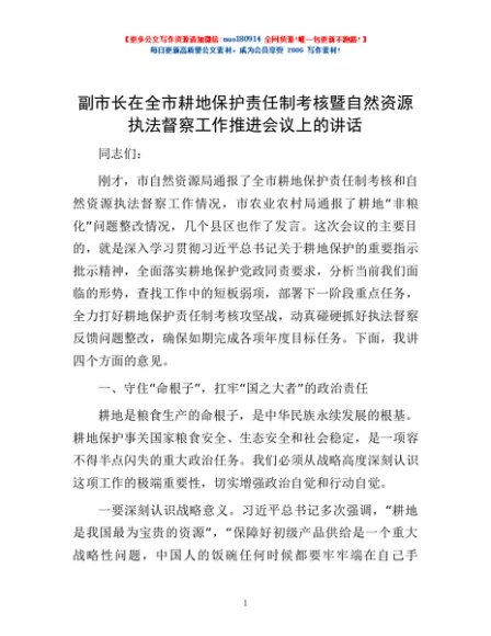 / 副市长在全市耕地保护责任制考核暨自然资源执法督察工作推进会议上的讲话