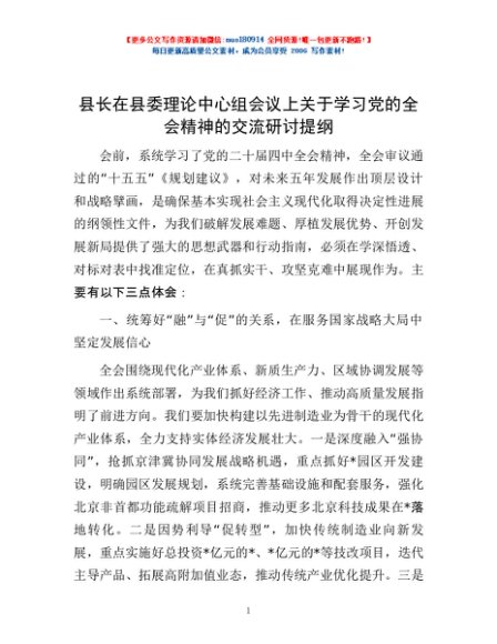 / 县长在县委理论中心组会议上关于学习党的全会精神的交流研讨提纲