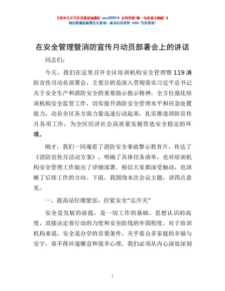/ 在安全管理暨消防宣传月动员部署会上的讲话