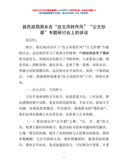 / 县民政局局长在“改文风转作风”“公文抄袭”专题研讨会上的讲话