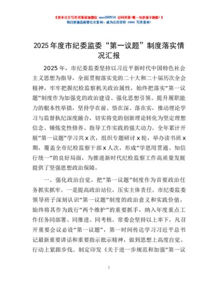 / 2025年度市纪委监委“第一议题”制度落实情况汇报