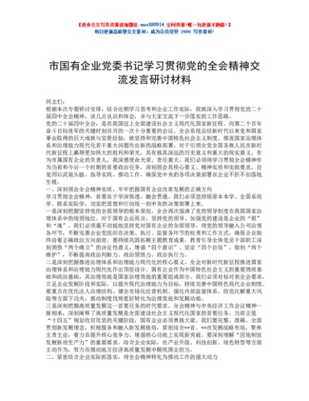 / 市国有企业党委书记学习贯彻党的全会精神交流发言研讨材料
