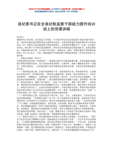 / 县纪委书记在全县纪检监察干部能力提升培训班上的党课讲稿