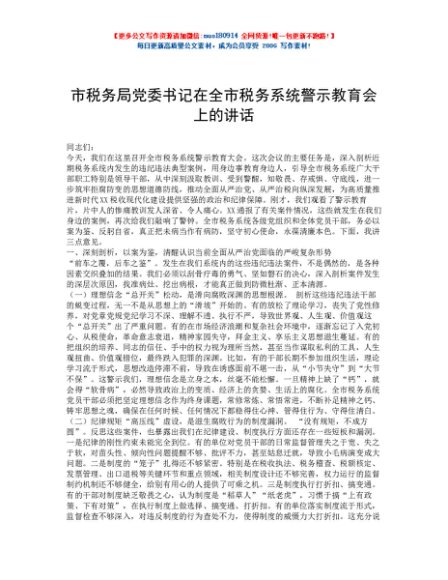 / 市税务局党委书记在全市税务系统警示教育会上的讲话