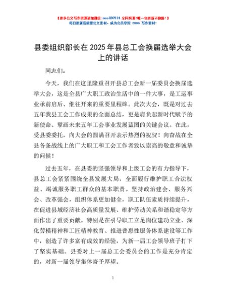 / 县委组织部长在2025年县总工会换届选举大会上的讲话