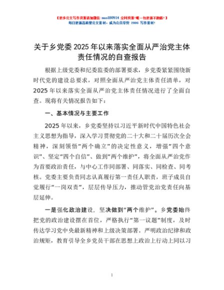 / 关于乡党委2025年以来落实全面从严治党主体责任情况的自查报告