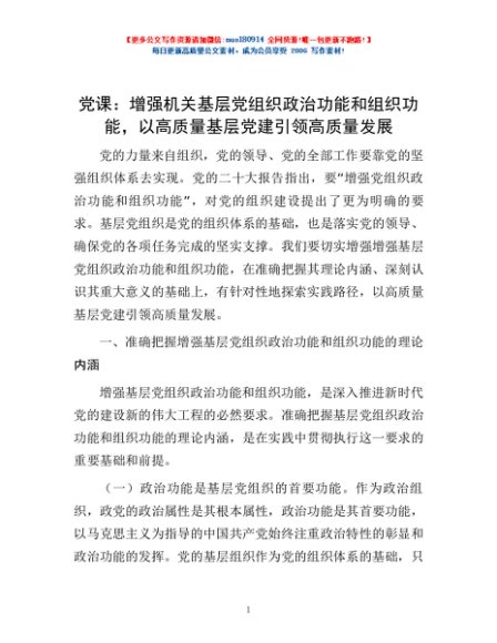 / 党课:增强机关基层党组织政治功能和组织功能,以高质量基层党建引领高质量发展