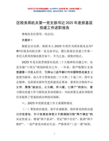 / 区税务局机关第一党支部书记2025年度抓基层党建工作述职报告