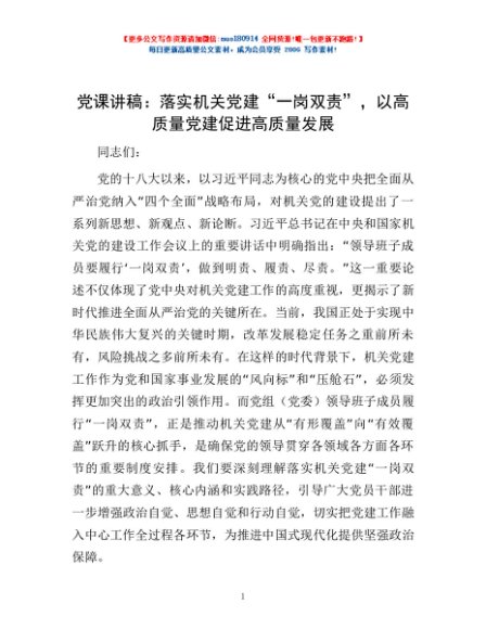 / 党课讲稿:落实机关党建“一岗双责”,以高质量党建促进高质量发展