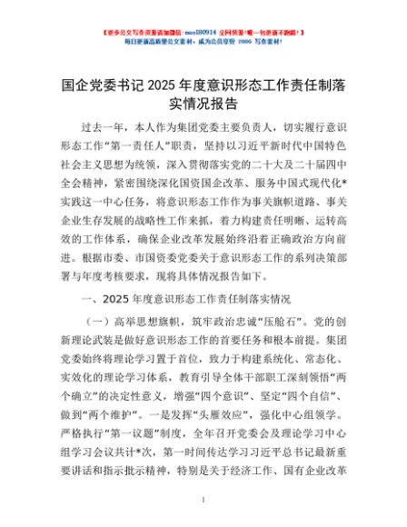 / 国企党委书记2025年度意识形态工作责任制落实情况报告