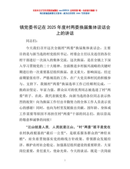 / 镇党委书记在2025年度村两委换届集体谈话会上的讲话