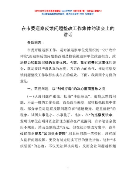 / 在市委巡察反馈问题整改工作集体约谈会上的讲话