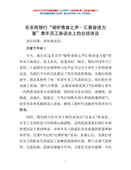 / 在农商银行“倾听青春之声·汇聚奋进力量”青年员工座谈会上的总结讲话