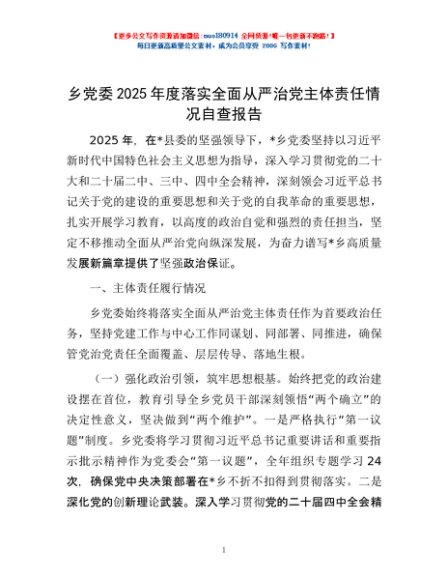 / 乡党委2025年度落实全面从严治党主体责任情况自查报告
