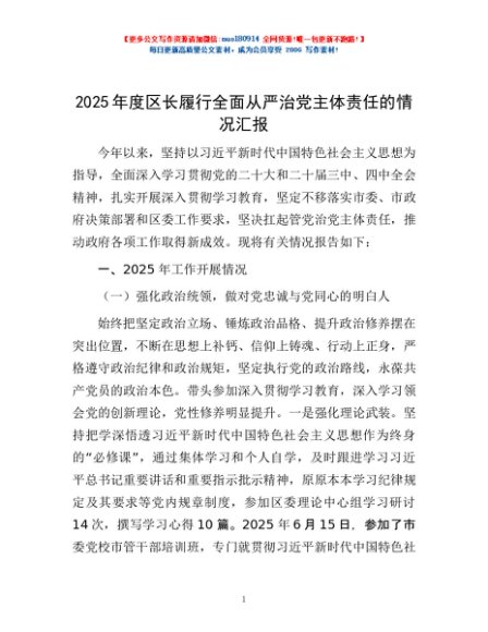 / 2025年度区长履行全面从严治党主体责任的情况汇报