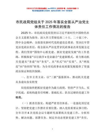 / 市民政局党组关于2025年落实全面从严治党主体责任工作情况的报告