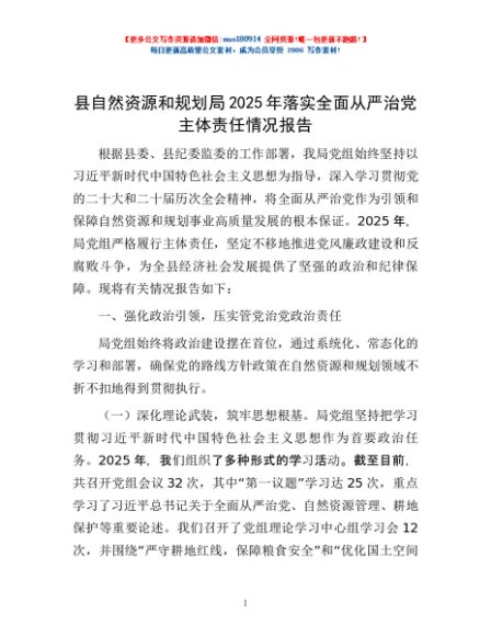 / 县自然资源和规划局2025年落实全面从严治党主体责任情况报告