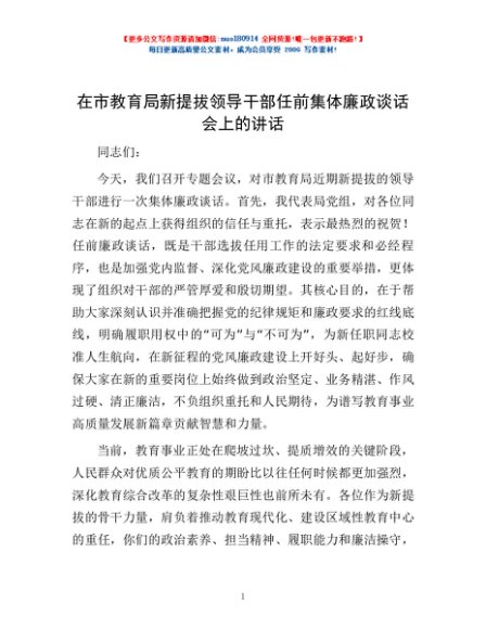 / 在市教育局新提拔领导干部任前集体廉政谈话会上的讲话