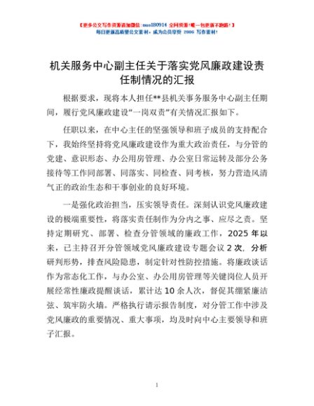 / 机关服务中心副主任关于落实党风廉政建设责任制情况的汇报