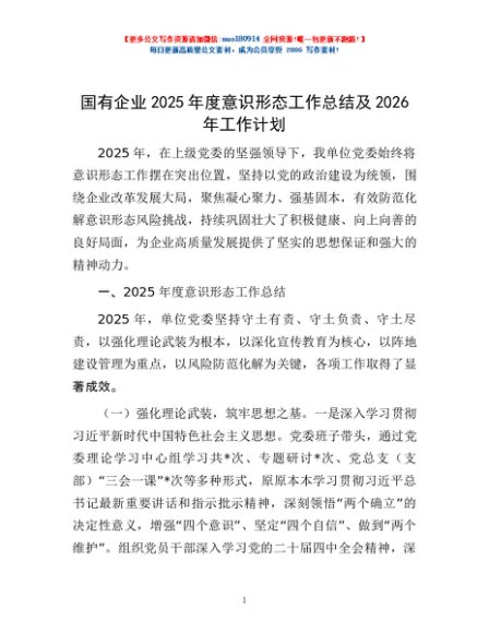 / 国有企业2025年度意识形态工作总结及2026年工作计划