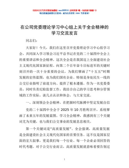 / 在公司党委理论学习中心组上关于全会精神的学习交流发言