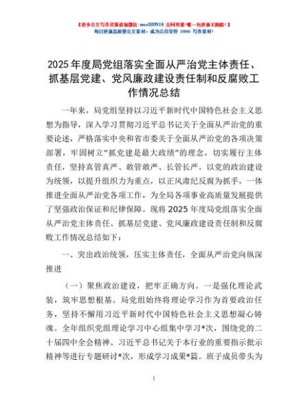 / 2025年度局党组落实全面从严治党主体责任、抓基层党建、党风廉政建设责任制和反腐败工作情况总结