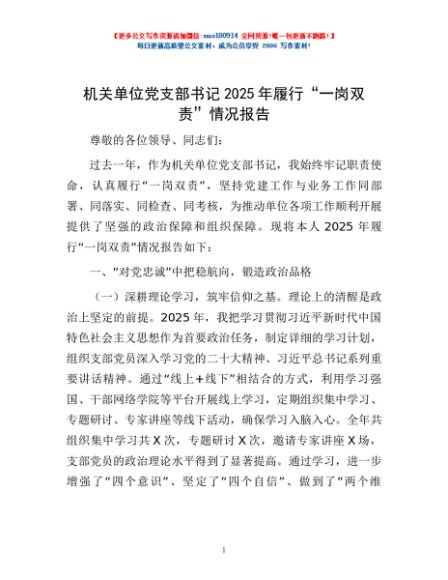 / 机关单位党支部书记2025年履行“一岗双责”情况报告