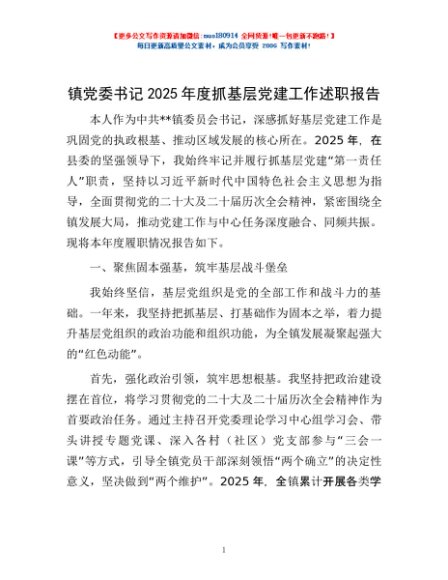/ 镇党委书记2025年度抓基层党建工作述职报告