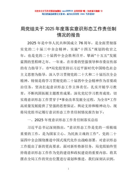 / 局党组关于2025年度落实意识形态工作责任制情况的报告