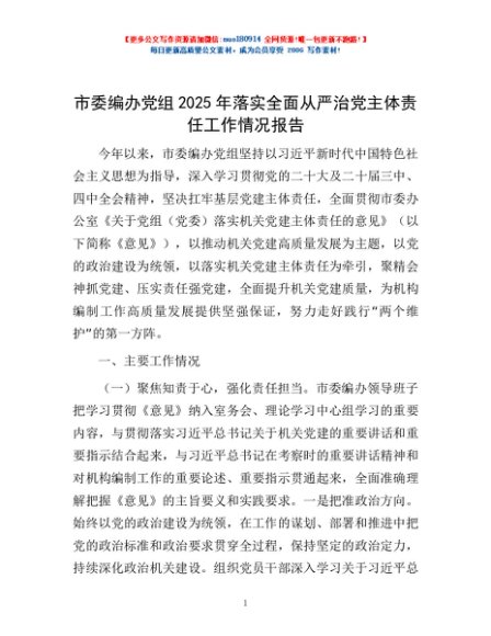 / 市委编办党组2025年落实全面从严治党主体责任工作情况报告