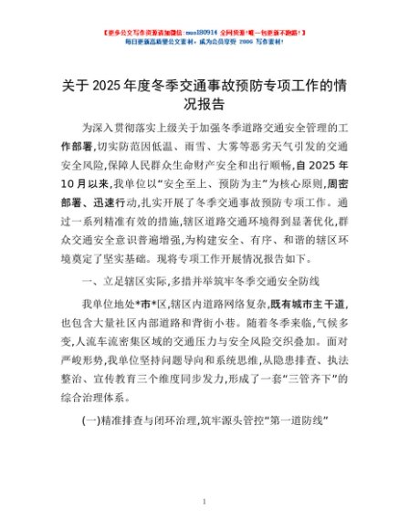 / 关于2025年度冬季交通事故预防专项工作的情况报告