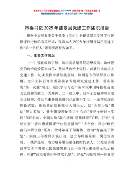 / 市委书记2025年抓基层党建工作述职报告