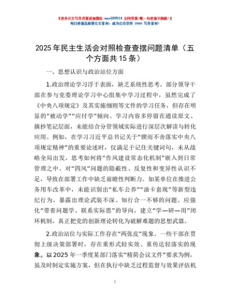 / 2025年民主生活会对照检查查摆问题清单(五个方面共15条)