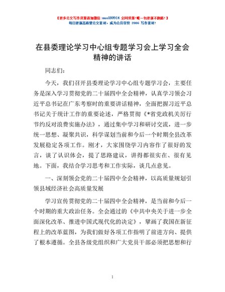 / 在县委理论学习中心组专题学习会上学习全会精神的讲话